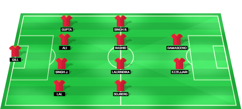 Gill (GK), Lal (DF), Singh J. (DF), Ali (DF), Gupta (DF), Sojberg (MF), Lalrindika (MF), Rashid (MF), Singh B. (MF), Ezzejjari (FW), Damasceno (FW).