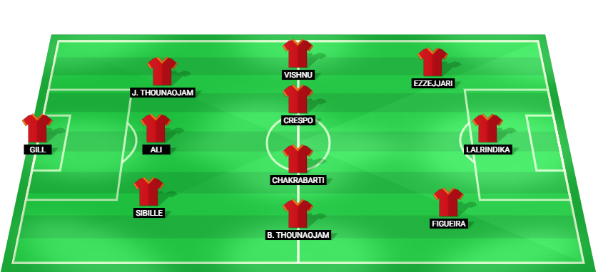 Gill (GK), Sibille (DF), Ali (DF), J. Thounaojam (DF), B. Thounaojam (MF), Chakrabarti (MF), Crespo (MF), Vishnu (MF), Figueira (FW), Ezzejjari (FW), Lalrindika (FW).