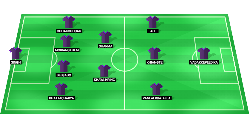 Singh (GK), Bhattacharya (DF), Delgado (DF), Moirangthem (DF), Chhakchhuak (DF), Khawlhring (MF), Sharma (MF), Vanlalruatfela (MF), Khiangte (MF), Ali (MF), Vadakkepeedika (FW).