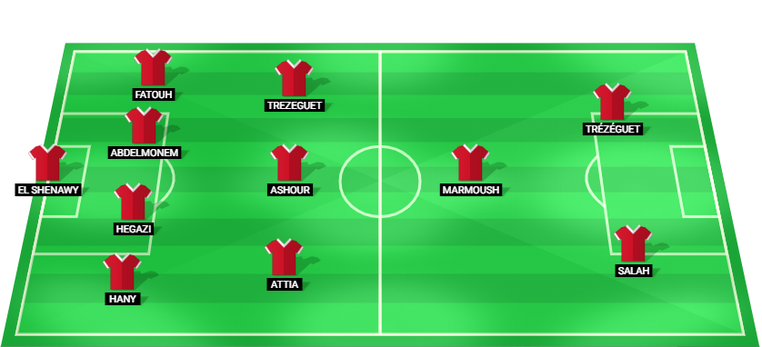 El Shenawy (GK), Hany (DF), Hegazi (DF), Abdelmonem (DF), Fatouh (DF), Attia (MF), Ashour (MF), Trezeguet (MF), Marmoush (MF), Salah (FW), Trézéguet (FW).