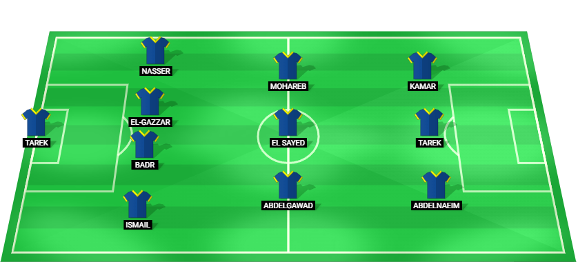Tarek (GK), Ismail (DF), Badr (DF), El-Gazzar (DF), Nasser (DF), Abdelgawad (MF), El Sayed (MF), Mohareb (MF), Abdelnaeim (FW), Tarek (FW), Kamar (FW)