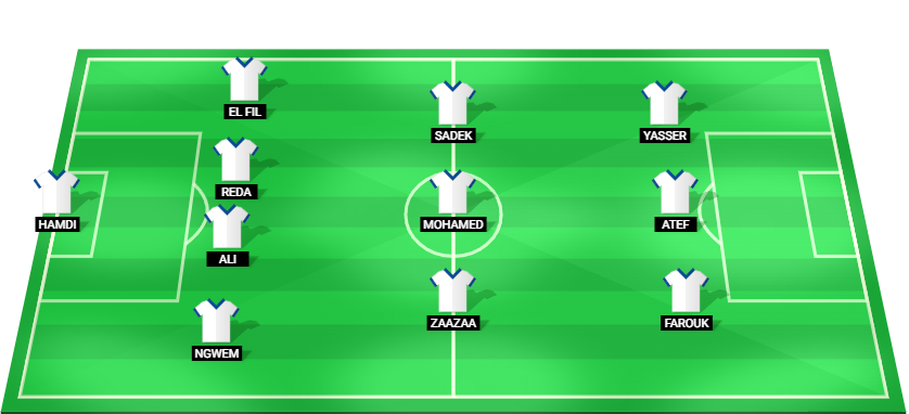 Hamdi (GK), Ngwem (DF), Ali (DF), Reda (DF), El Fil (DF), Zaazaa (MF), Mohamed (MF), Sadek (MF), Farouk (FW), Atef (FW), Yasser (FW)