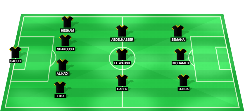 Saoud (GK), Tito (DF), Al Kadi (DF), Shakoush (DF), Hesham (DF), Gaber (MF), El Wahsh (MF), Abdelnasser (MF), Ojera (FW), Mohamed (FW), Semana (FW).