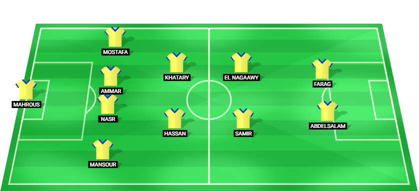 Mahrous (GK), Mansour (DF), Nasr (DF), Ammar (DF), Mostafa (DF), Hassan (MF), Khatary (MF), Samir (MF), El Nagaawy (AMMF, Abdelsalam (FW), Farag (FW).
