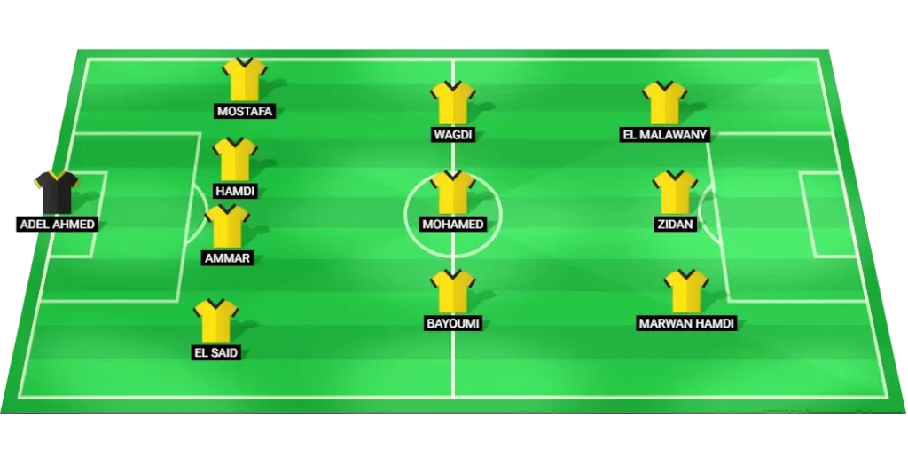Tamer Mostafa is expected to field a familiar lineup, relying on defensive stability: Adel Ahmed (GK), Abdelkarim Mostafa (DF), Emad Hamdi (DF), Mohamed Ammar (DF), Abdallah El Said (DF), Mohamed Wagdi (MF), Hesham Mohamed (MF), Mohamed Bayoumi (MF), Ali El Malawany (FW), Mohamed Zidan (FW), Marwan Hamdi (FW).