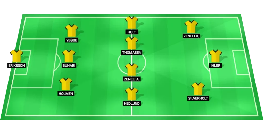 Elfsborg Predicted Lineup: Eriksson (GK), Holmen (DF), Buhari (DF), Yegbe (DF), Hedlund (MF), Zeneli A. (MF), Thomasen (MF), Hult (MF), Zeneli B. (FW), Ihler (FW), Silverholt (FW)