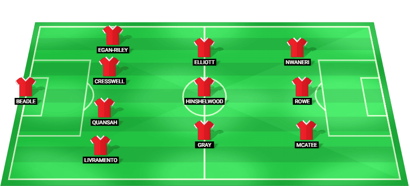 Beadle (GK), Livramento (DF), Quansah (DF), Cresswell (DF), Egan-Riley (DF), Gray (MF), Hinshelwood (MF), Elliott (MF), McAtee (FW), Rowe (FW), Nwaneri (FW)