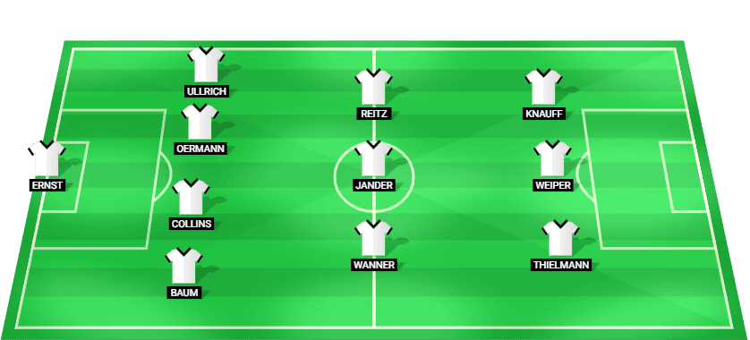 Ernst (GK), Baum (DF), Collins (DF), Oermann (DF), Ullrich (DF), Wanner (MF), Jander (MF), Reitz (MF), Thielmann (FW), Weiper (FW), Knauff (FW)