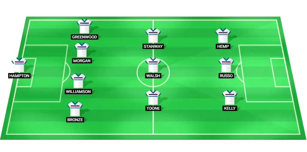 England Women Predicted Lineup (4-3-3): H. Hampton (GK), L. Bronze (DF), L. Williamson (DF), E. Morgan (DF), A. Greenwood (DF), E. Toone (MF), K. Walsh (MF), G. Stanway (MF), C. Kelly (FW), A. Russo (FW), L. Hemp (FW)
