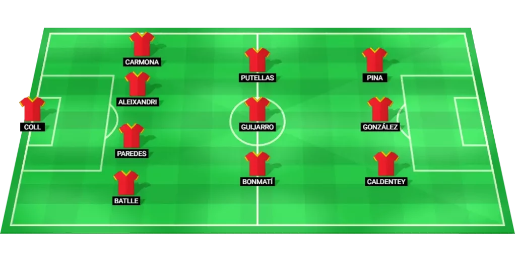 Spain Women Predicted Lineup (4-3-3): C. Coll (GK), O. Batlle (DF), I. Paredes (DF), L. Aleixandri (DF), O. Carmona (DF), A. Bonmatí (MF), P. Guijarro (MF), A. Putellas (MF), M. Caldentey (FW), E. González (FW), C. Pina (FW)