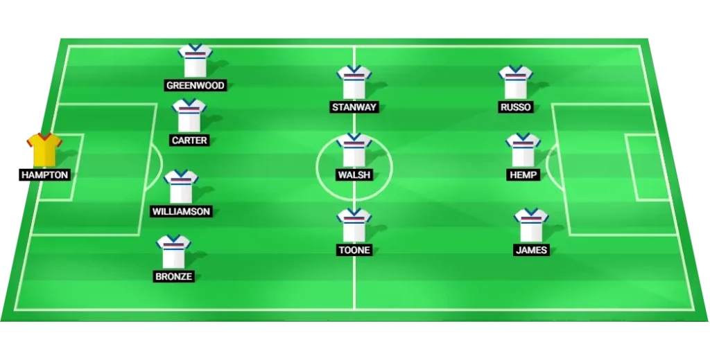 England Women (4-3-3): H. Hampton (GK), L. Bronze (DF), L. Williamson (DF), J. Carter (DF), A. Greenwood (DF), E. Toone (MF), K. Walsh (MF), G. Stanway (MF), L. James (FW), L. Hemp (FW), A. Russo (FW)