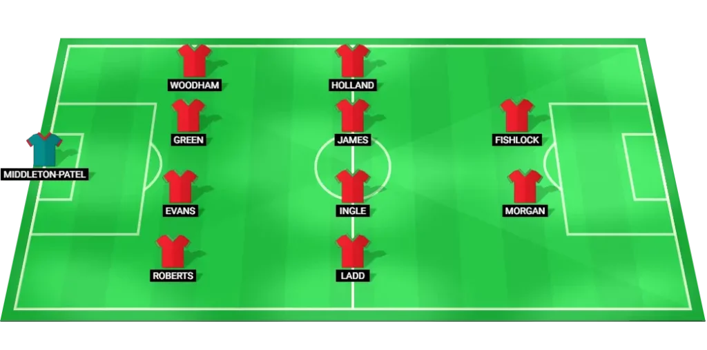 Wales Women (4-4-2): S. Middleton-Patel (GK), R. Roberts (DF), G. Evans (DF), J. Green (DF), L. Woodham (DF), H. Ladd (MF), S. Ingle (MF), A. James (MF), C. Holland (MF), F. Morgan (FW), J. Fishlock (FW)