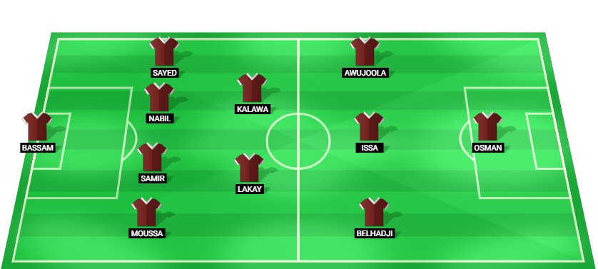 Bassam (GK), Moussa (DF), Samir (DF), Nabil (DF), Sayed (DF), Lakay (MF), Kalawa (MF), Belhadji (MF), Issa (MF), Awujoola (MF), Osman (FW)