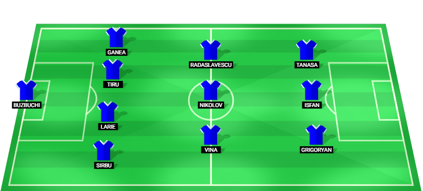 Buzbuchi (GK), Sirbu (DF), Larie (DF), Tiru (DF), Ganea (DF), Vina (MF), Nikolov (MF), Radaslavescu (MF), Grigoryan (FW), Isfan (FW), Tanasa (FW)
