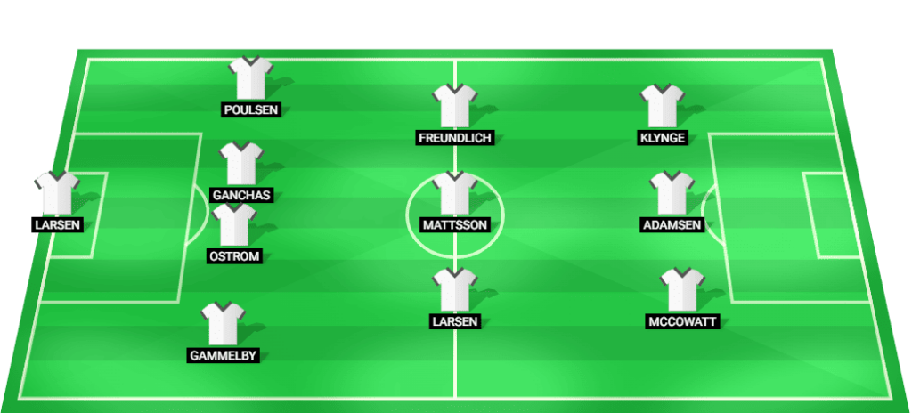 Larsen (GK), Gammelby (DF), Ostrom (DF), Ganchas (DF), Poulsen (DF), Larsen (MF), Mattsson (MF), Freundlich (MF), McCowatt (FW), Adamsen (FW), Klynge (FW)