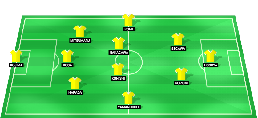 Kojima (GK), Harada (DF), Koga (DF), Mitsumaru (DF), Yamanouchi (MF), Konishi (MF), Nakagawa (MF), Komi (MF), Koizumi (MF), Segawa (MF), Hosoya (FW).
