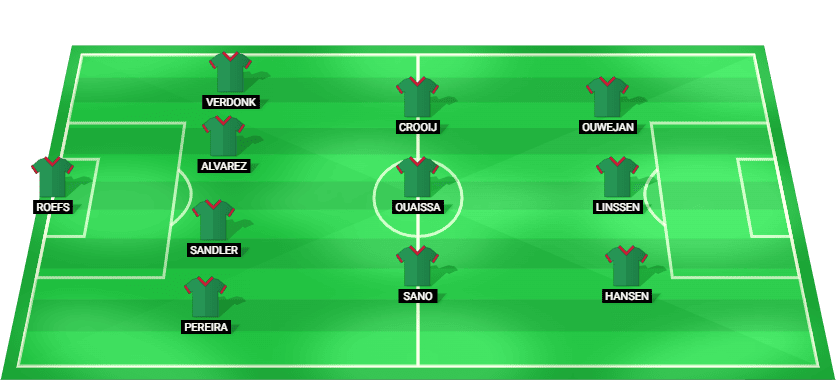 Roefs (GK), Pereira (DF), Sandler (DF), Marquez Alvarez (DF), Verdonk (DF), Sano (MF), Ouaissa (MF), Van Crooij (MF), Hansen (FW), Linssen (FW), Ouwejan (FW).