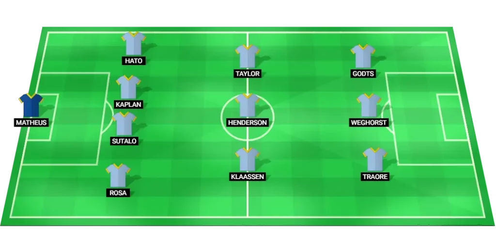 Ajax Possible Starting Lineup (4-3-3): Matheus (GK), Rosa (DF), Sutalo (DF), Kaplan (DF), Hato (DF), Klaassen (MF), Henderson (MF), Taylor (MF), Traore (FW), Weghorst (FW), Godts (FW)