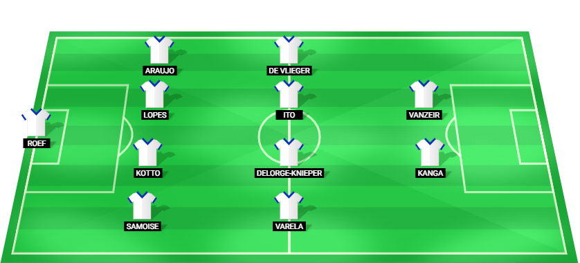 Roef (GK), Samoise (DF), Kotto (DF), Lopes (DF), Araujo (DF), Varela (MF), Delorge-Knieper (MF), Ito (MF), De Vlieger (MF), Kanga (FW), Vanzeir (FW)