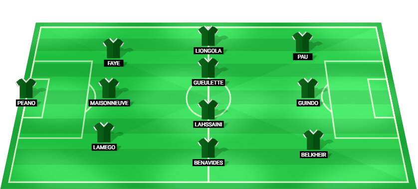 Peano (GK), Lamego (DF), Maisonneuve (DF), Faye (DF), Benavides (MF), Lahssaini (MF), Gueulette (MF), Liongola (MF), Belkheir (FW), Guindo (FW), Pau (FW)