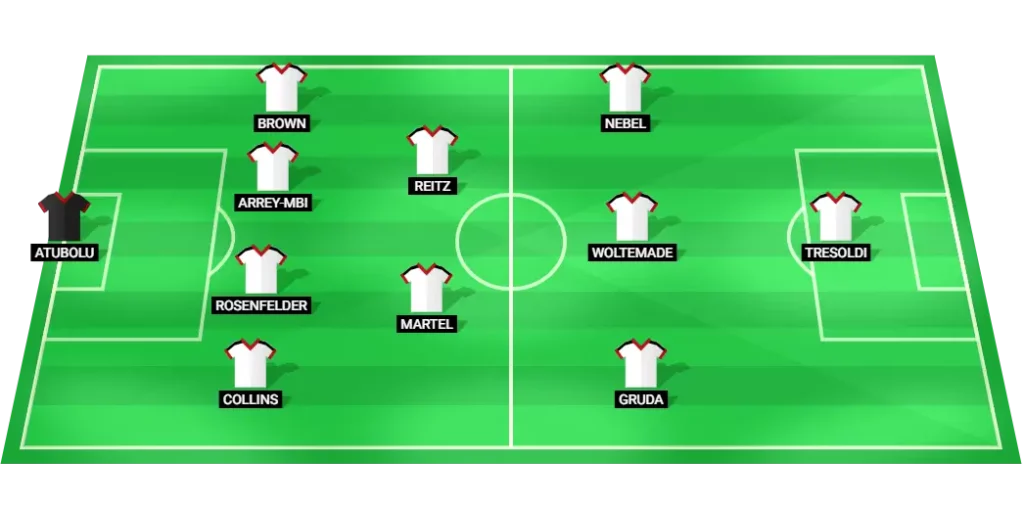 Germany U21 Predicted Lineup: N. Atubolu (GK), N. Collins (DF), M. Rosenfelder (DF), B. Arrey-Mbi (DF), N. Brown (DF), E. Martel (MF), R. Reitz (MF), B. Gruda (MF), N. Woltemade (FW), P. Nebel (MF), N. Tresoldi (FW).