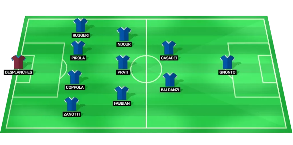 Italy U21 Predicted Lineup: S. Desplanches (GK), M. Zanotti (DF), D. Coppola (DF), L. Pirola (DF), M. Ruggeri (DF), G. Fabbian (MF), M. Prati (MF), C. Ndour (MF), T. Baldanzi (MF), C. Casadei (MF), W. Gnonto (FW).