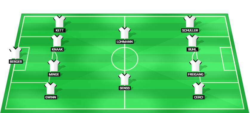 Berger (GK), Gwinn (DF), Minge (DF), Knaak (DF), Kett (DF), Senss (MF), Lohmann (MF), Cerci (FW), Freigang (FW), Buhl (FW), Schuller (FW)