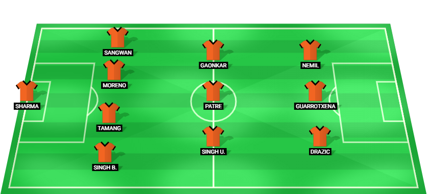 Sharma (GK), Singh B. (DF), Tamang (DF), Moreno (DF), Sangwan (DF), Singh U. (MF), Patre (MF), Gaonkar (MF), Drazic (FW), Guarrotxena (FW), Nemil (FW)