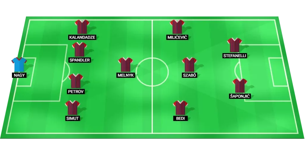 Fehervar FC are likely to deploy their 4-1-3-2 setup: Nagy (GK), Simut (DF), Petrov (DF), Spandler (DF), Kalandadze (DF), Melnyk (MF), Bedi (MF), Szabó (MF), Milićević (MF), Šaponjić (FW), Stefanelli (FW).