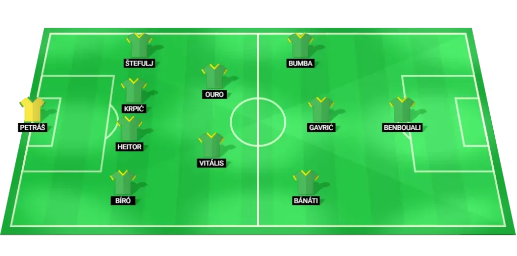 Gyori ETO are expected to stick with their effective 4-2-3-1 formation: Petráš (GK), Bíró (DF), Heitor (DF), Krpić (DF), Štefulj (DF), Vitális (MF), Ouro (MF), Gavrić (MF), Bumba (MF), Bánáti (MF), Benbouali (FW).