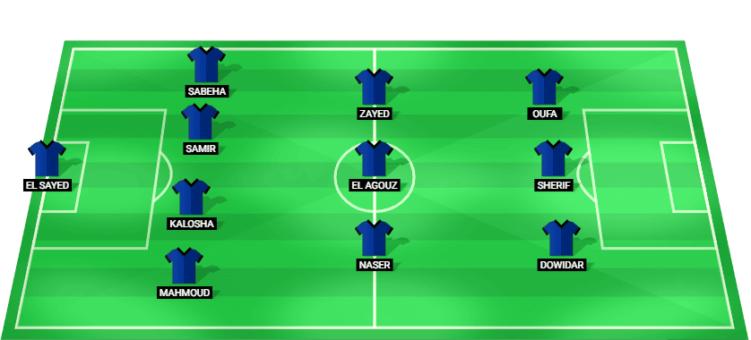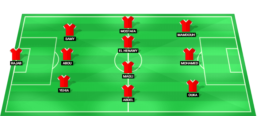 Rajab A. (GK), Yehia K. (DF), Abou I. (DF), Samy M. (DF), Abdel Hakeem I. (MF), Magli M. (MF), El Henawy F. (MF), Mostafa M. (MF), Ouka M. (FW), Mohamed H. (FW), Mamdouh M. (FW)