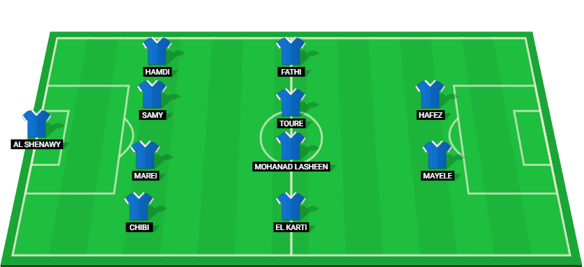 Al Shenawy (GK), Chibi (DF), Marei (DF), Samy (DF), Hamdi (DF), El Karti (MF), Mohanad Lasheen (MF), Toure (MF), Fathi (MF), Mayele (FW), Hafez (FW).
