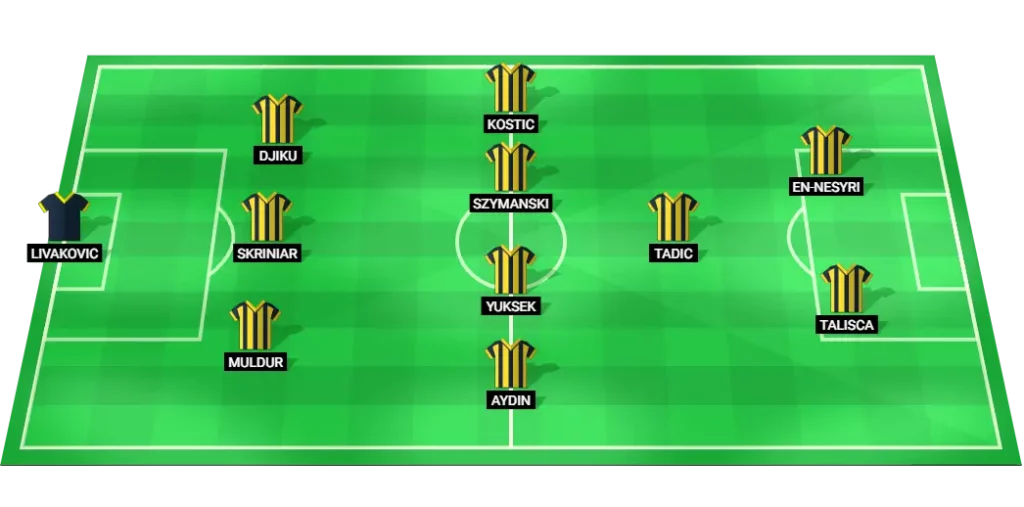 Fenerbahce Expected Lineup: Dominik Livakovic (GK), Muldur (DF), Skriniar (DF), Djiku (DF), Aydin (MF), Yuksek (MF), Szymanski (MF), Kostic (MF), Dusan Tadic (MF), Talisca (FW), En-Nesyri (FW)