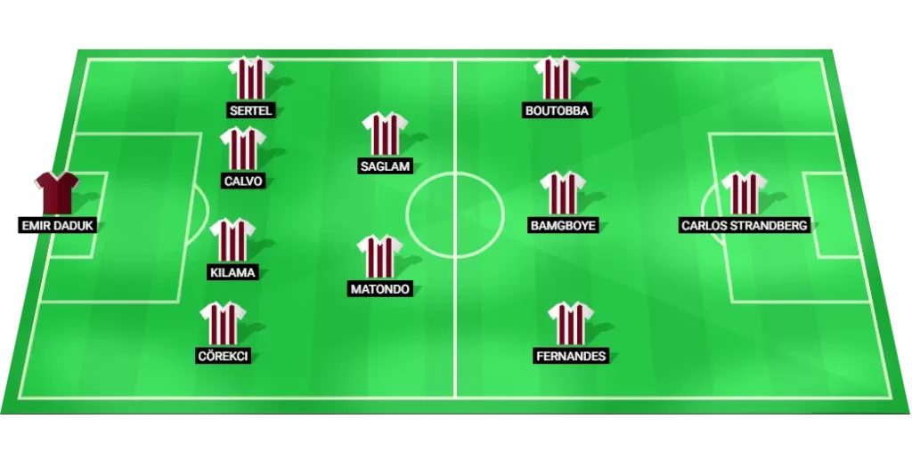 Hatayspor Expected Lineup: Emir Daduk (GK), Cörekci (DF), Kilama (DF), Calvo (DF), Sertel (DF), Matondo (MF), Görkem Saglam (MF), Fernandes (MF), Bamgboye (MF), Boutobba (MF), Carlos Strandberg (FW)