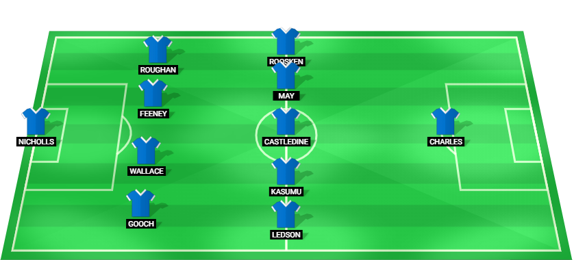 Nicholls (GK), Gooch (DF), Wallace (DF), Feeney (DF), Roughan (DF), Ledson (MF), Kasumu (MF), Castledine (MF), May (MF), Roosken (MF), Charles (FW)