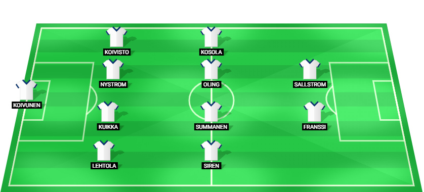 Koivunen (GK), Lehtola (DF), Kuikka (DF), Nystrom (DF), Koivisto (DF), Siren (MF), Summanen (MF), Oling (MF), Kosola (MF), Franssi (FW), Sallstrom (FW)