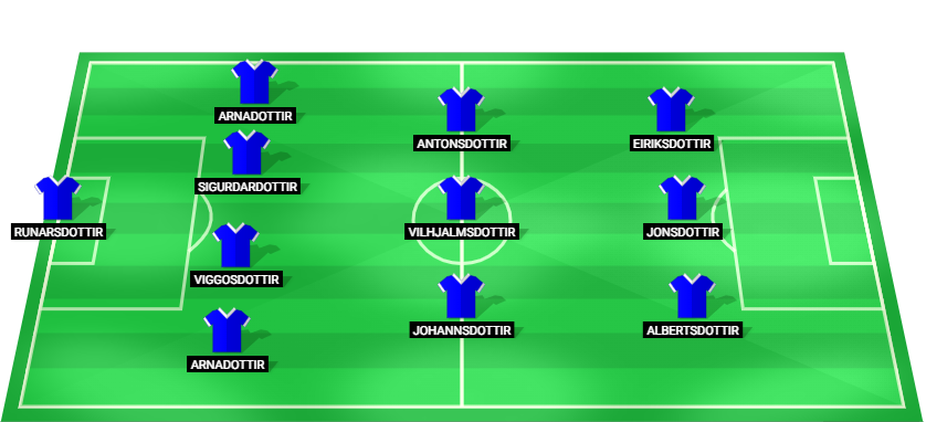 Runarsdottir (GK), Arnadottir G. (DF), Viggosdottir (DF), Sigurdardottir (DF), Arnadottir (DF), Johannsdottir (MF), Vilhjalmsdottir (MF), Antonsdottir (MF), Albertsdottir (FW), Jonsdottir (FW), Eiriksdottir (FW)
