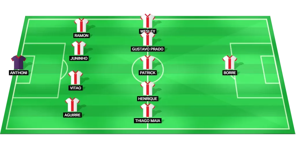 Internacional Predicted Lineup: Anthoni (GK), Aguirre (DF), Vitao (DF), Juninho (DF), Ramon (DF), Thiago Maia (MF), Bruno Henrique (MF), Alan Patrick (MF), Gustavo Prado (MF), Wesley (MF), Borre (FW)