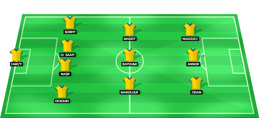 Fawzy (GK), Desouki (DF), Nasr (DF), El Saaiy (DF), Sobhy (DF), Makhlouf (MF), Bayoumi (MF), Magdy (MF), Zidan (FW), Annor (FW), Nagguez (FW).