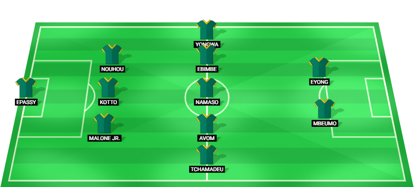 Epassy (GK), Malone Jr. (DF), Kotto (DF), Nouhou (DF), Tchamadeu (MF), Avom (MF), Namaso (MF), Ebimbe (MF), Yongwa (MF), Mbeumo (FW), Eyong (FW).