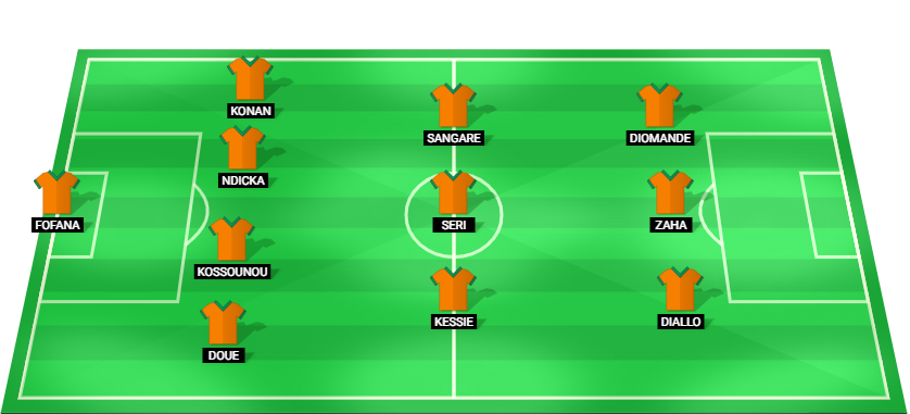 Fofana (GK), Doue (DF), Kossounou (DF), Ndicka (DF), Konan (DF), Kessie (MF), Seri (MF), Sangare (MF), Diallo (FW), Zaha (FW), Diomande (FW).