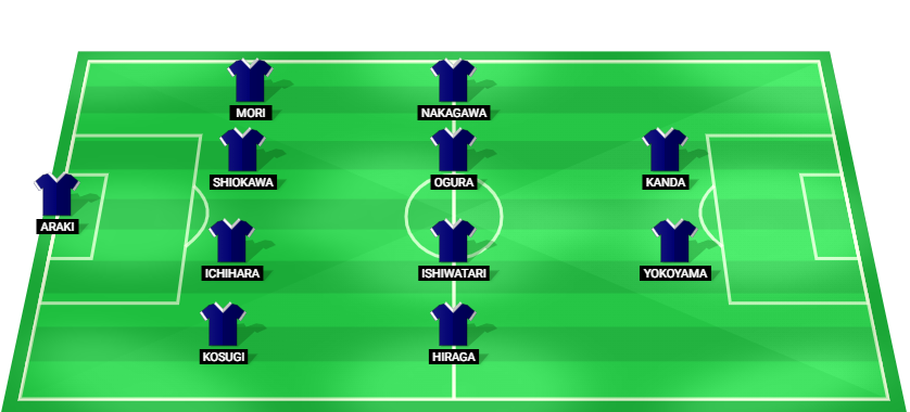 Araki (GK), Kosugi (DF), Ichihara (DF), Shiokawa (DF), Mori (DF), Hiraga (MF), Ishiwatari (MF), Ogura (MF), Nakagawa (MF), Yokoyama (FW), Kanda (FW)