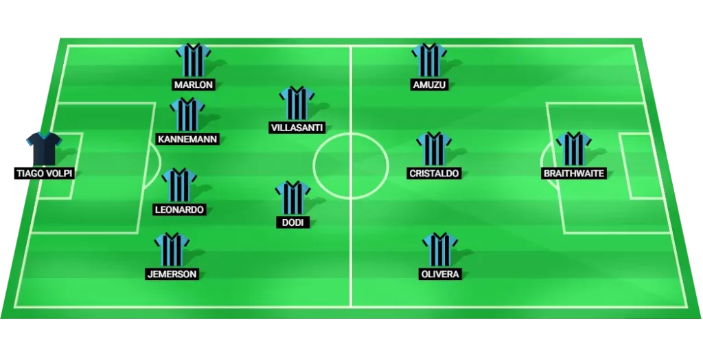Gremio are likely to deploy a 4-2-3-1 formation, focusing on defensive stability and quick counters: Tiago Volpi (GK), Jemerson (DF), Walter Kannemann (DF), Wagner Leonardo (DF), Marlon (DF), Dodi (MF), Mathías Villasanti (MF), Cristian Olivera (MF), Franco Cristaldo (MF), Francis Amuzu (MF), Martin Braithwaite (FW).