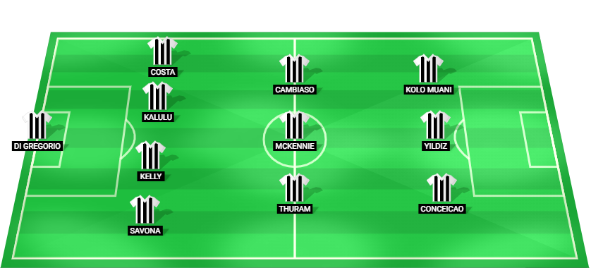 Di Gregorio (GK), Savona (DF), Kelly (DF), Kalulu (DF), Costa (DF), Thuram (MF), McKennie (MF), Cambiaso (MF), Conceicao (FW), Yildiz (FW), Kolo Muani (FW)