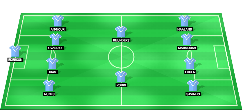 Ederson (GK), Nunes (DF), Dias (DF), Gvardiol (DF), Ait-Nouri (DF), Rodri (MF), Reijnders (MF), Savinho (FW), Foden (FW), Marmoush (FW), Haaland (FW)