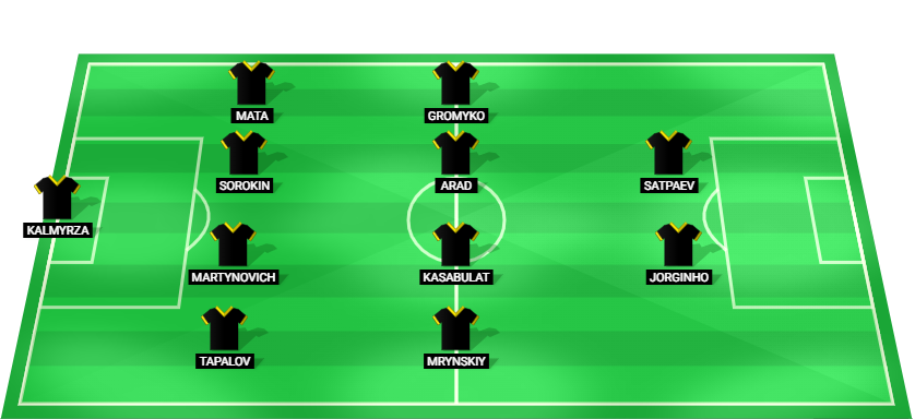 Kalmyrza (GK), Tapalov (DF), Martynovich (DF), Sorokin (DF), Mata (DF), Mrynskiy (MF), Kasabulat (MF), Arad (MF), Gromyko (MF), Jorginho (FW), Satpaev (FW)