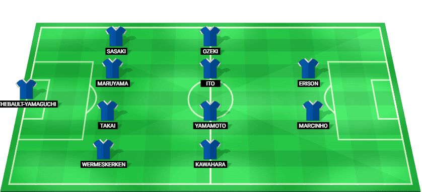 Thebault-Yamaguchi (GK), Wermeskerken (DF), Takai (DF), Maruyama (DF), Sasaki (DF), Kawahara (MF), Yamamoto (MF), Ito (MF), Ozeki (MF), Marcinho (FW), Erison (FW)