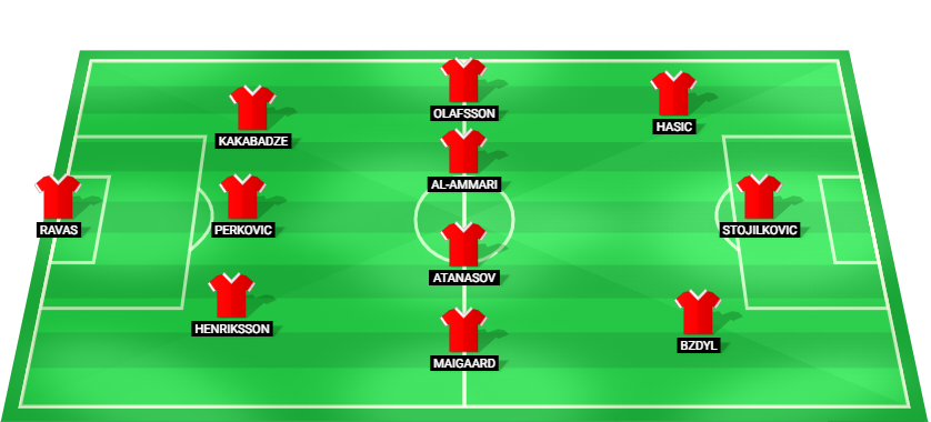 Ravas (GK), Henriksson (DF), Perkovic (DF), Kakabadze (DF), Maigaard (MF), Atanasov (MF), Al-Ammari (MF), Olafsson (MF), Bzdyl (FW), Stojilkovic (FW), Hasic (FW)