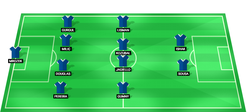 Mrozek (GK), Pereira (DF), Douglas (DF), Milic (DF), Gurgul (DF), Gumny (MF), Jagiello (MF), Kozubal (MF), Lisman (MF), Sousa (FW), Ishak (FW)