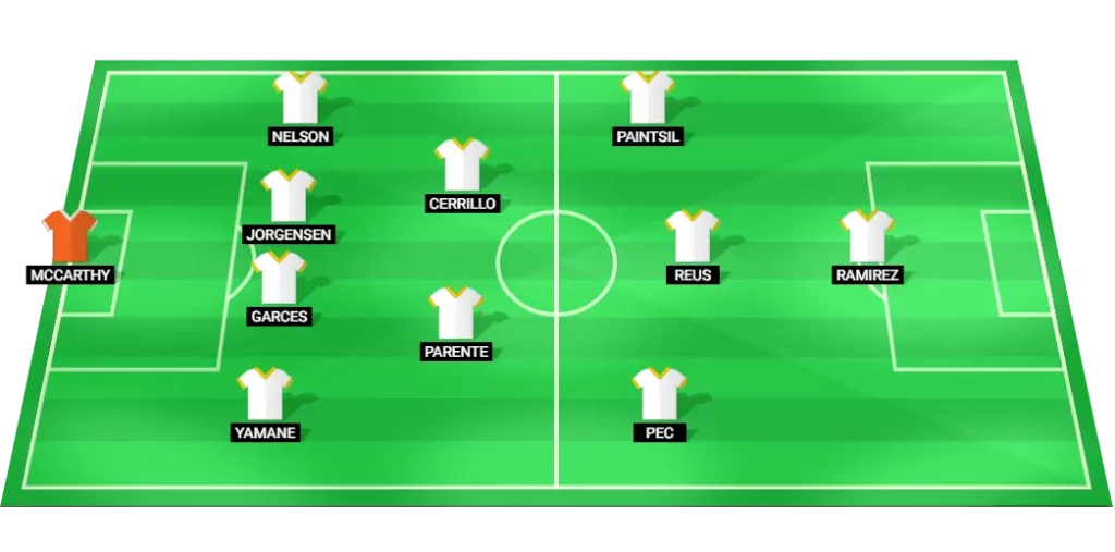 With key players returning from suspension, the Galaxy are expected to field: McCarthy (GK), Yamane (DF), Garces (DF), Jorgensen (DF), Nelson (DF), Parente (MF), Cerrillo (MF), Pec (MF), Reus (MF), Paintsil (MF), Ramirez (FW).
